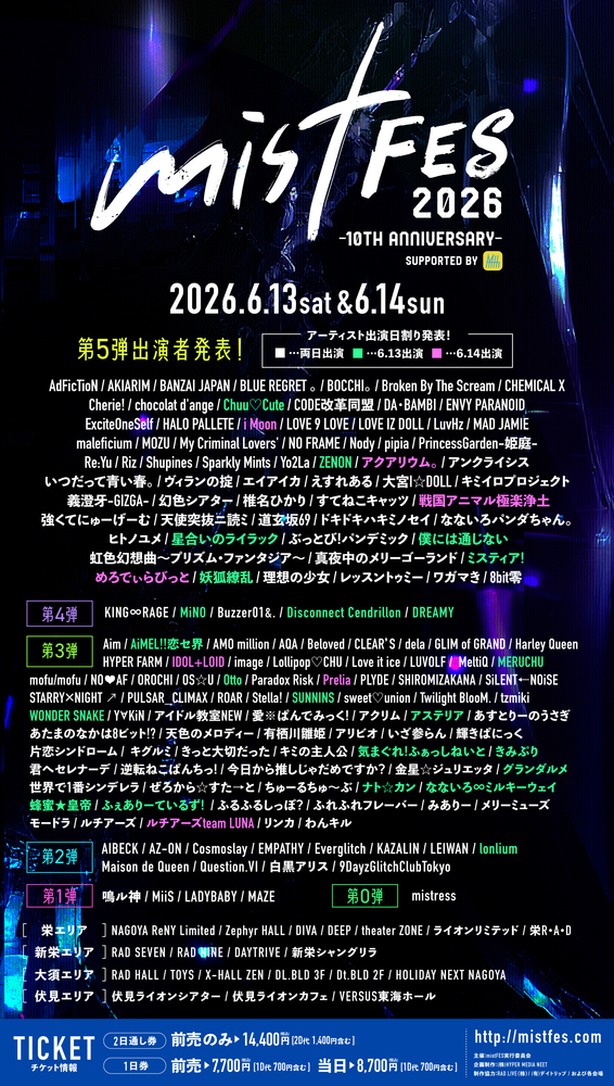 mistFES2026 -10th anniversary- Supported by My-th SCHEDULE 2026/06/13(土) ■日程:6月13日■料金:2日通し券/前売のみ14,400円(2D代含む) 1日券/前売7,700円 当日8,700円(各1D代含む)🔗mistfes.com 〖 お目当て特典 〗🎁後日発表!! URLをコピーする 報告する