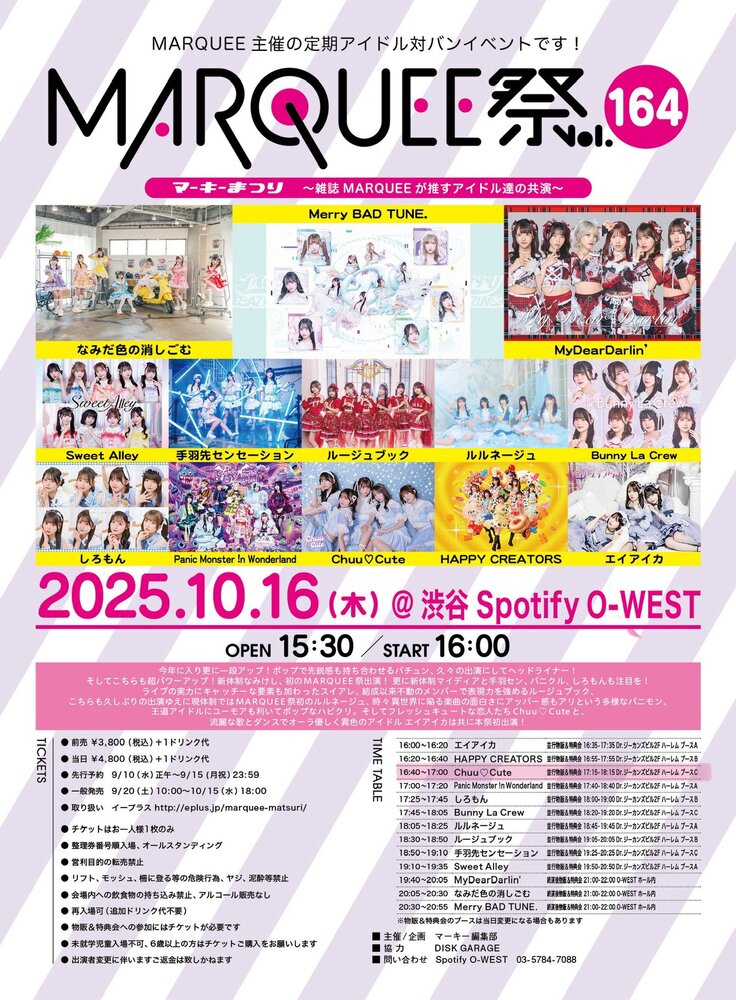 『MARQUEE祭 Vol.164』 SCHEDULE 2025/10/16(木) 渋谷Spotify O-WEST 日時10月16日(木) 場所:渋谷Spotify O-WEST 🎤:16:40~17:00 📸:17:15~18:15 〖 お目当て特典 〗 🎁お目当てポイント 2pt 🎁サインありチェキ券1枚 URLをコピーする 報告する